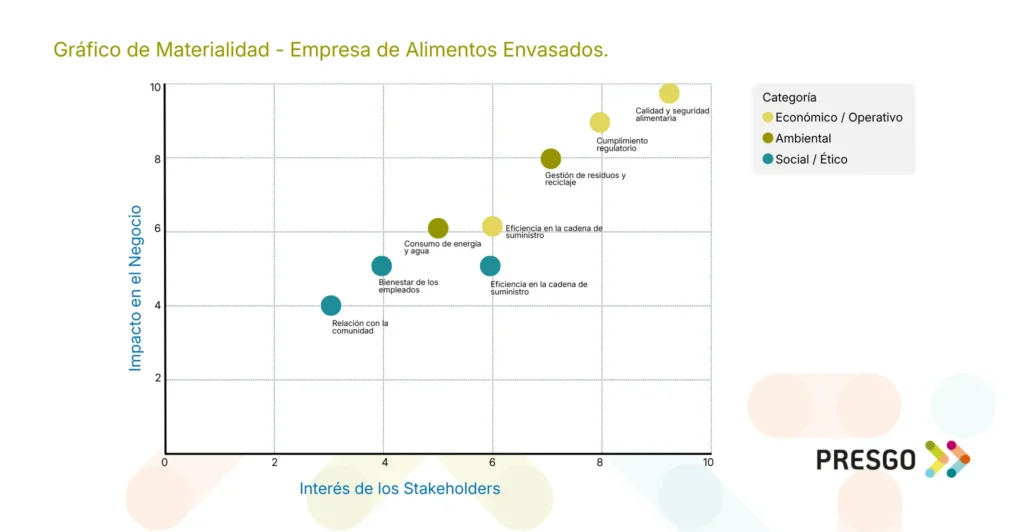 Los temas en la esquina superior derecha son los más críticos tanto para el negocio como para los stakeholders. Esto permite priorizar acciones estratégicas y de sostenibilidad.